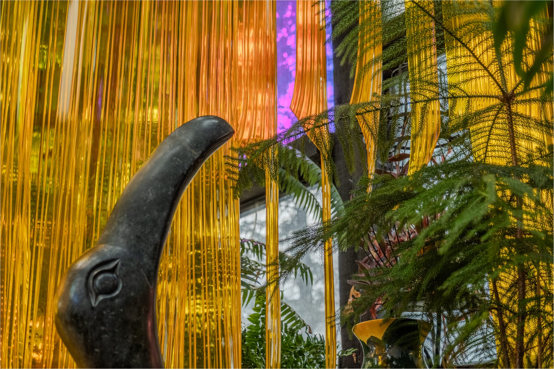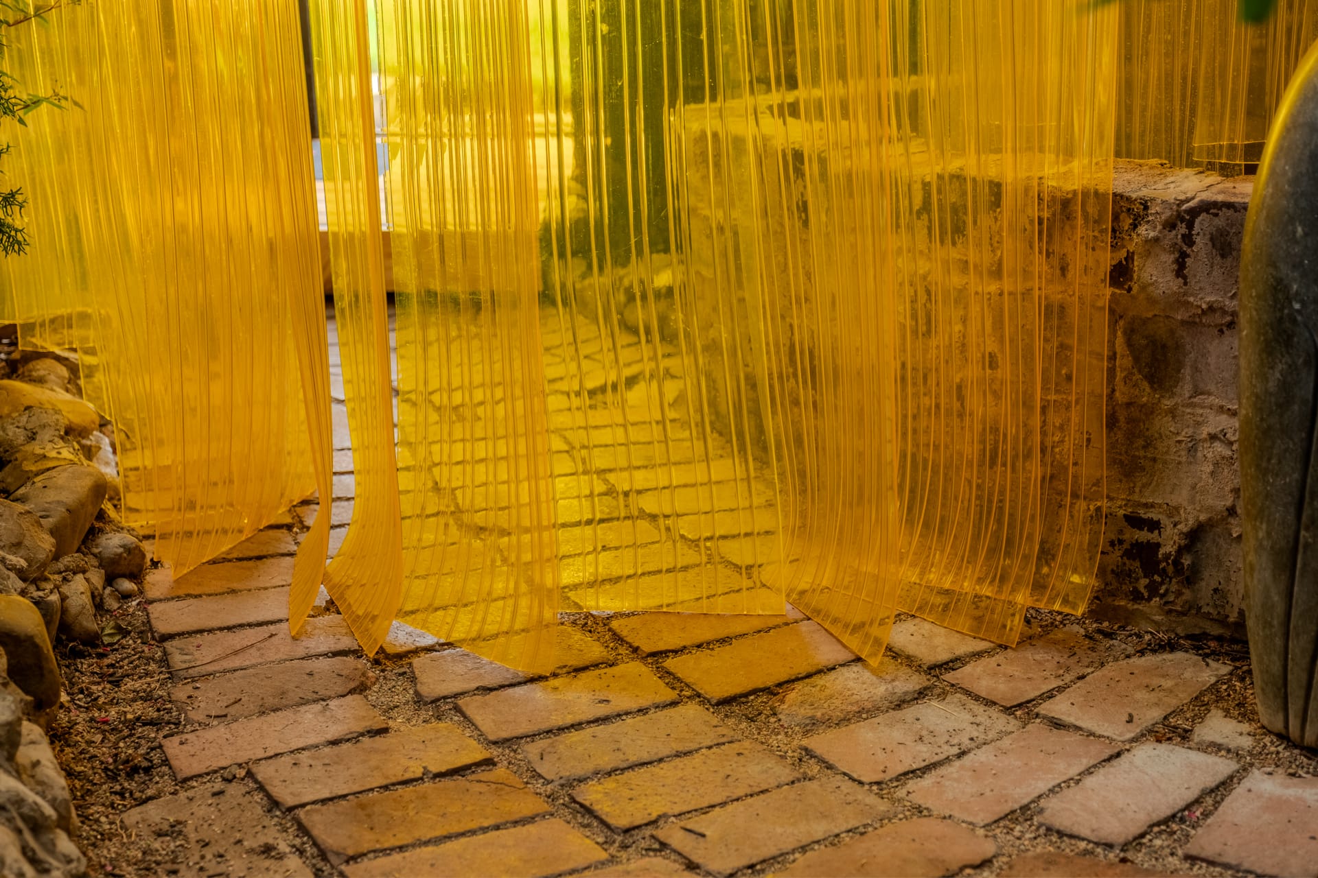 Living Curtain is a time-based site-specific installation in the botanical garden at Leighton Art Centre. Made from strips of polyvinyl chloride (PVC), Living Curtain explores this material’s potential liveliness and relationship to its environment. When placed within the context of the LAC’s botanical garden, Living Curtain complicates the contentious relationship between what we accept as being living with what we consider to be lifeless. Throughout the exhibition year as the Living Curtain shifts and settles, the plants will adjust to its contoured cuts, reaching their limbs through and recoiling from the slats as markers of life and decay.